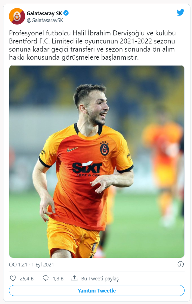Kulüpten transferle ilgili Kamuyu Aydınlatma Platformu'na (KAP) yapılan açıklamada, "Profesyonel futbolcu Halil İbrahim Dervişoğlu ve Kulübü Brentford F.C. Limited ile oyuncunun 2021-2022 sezonu sonuna kadar geçici transferi ve ön alım hakkı konusunda görüşmelere başlanmıştır" denildi.