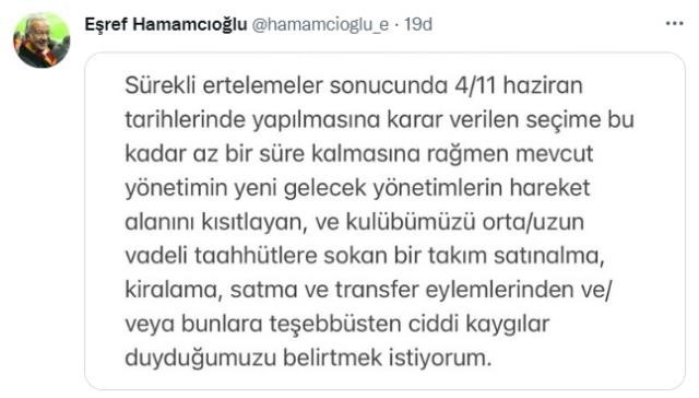Twitter'dan açıklama yapan Eşref Hamamcıoğlu mevcut yönetimi hedef aldı.