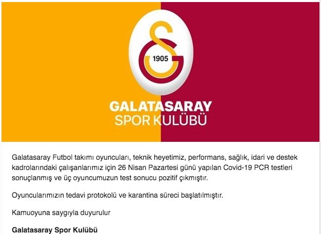Galatasaray'ın resmi Twitter hesabından yapılan açıklamaya göre üç futbolcunun corona virüs testi pozitif. Galatasaray’dan yapılan açıklamada korona olan futbolcuların isimleri açıklanmazken, "Futbol takımı oyuncuları, teknik heyetimiz, performans, sağlık, idari ve destek kadrolarındaki çalışanlarımız için 26 Nisan Pazartesi günü yapılan Covid-19 PCR testleri sonuçlanmış ve üç oyuncumuzun test sonucu pozitif çıkmıştır" denildi. Oyuncuların tedavi ve karantina sürecinin başladığı belirtildi.