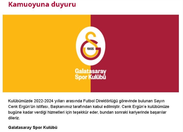 Galatasaray takımında ayrılıklar yaşanmaya devam ediyor. geçtiğimiz hafta istifa eden Galatasaray Sportif Direktörü Cenk Ergün'ün istifa talebi Başkan Dursun Özbek tarafından kabul edildi.