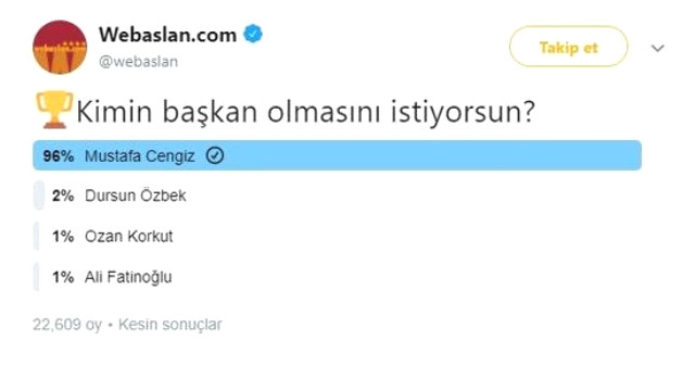 Webaslan'ın anketine oy veren 22 bin 609 sarı-kırmızılı taraftarın yüzde 96'sı Mustafa Cengiz'e oy verdi. Taraftarların istediği gibi, seçim sonuçlarında da Mustafa Cengiz birinci çıktı ve Galatasaray'ın yeni başkanı oldu. Taraftarlar arasındaki ankette Dursun Özbek yüzde 2 oy, Ozan Korkut ve Ali Fatinoğlu ise yüzde 1'er oy aldılar.