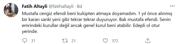 "Mustafa Cengiz efendi beni kulüpten atmaya doyamadın. 1 yıl önce alınmış bir kararı sanki yeni gibi tekrar tekrar duyuruyor. Bak Mustafa efendi. Senin emrindeki kurullar değil ancak genel kurul beni atabilir. Edepli ol otur yerinde."