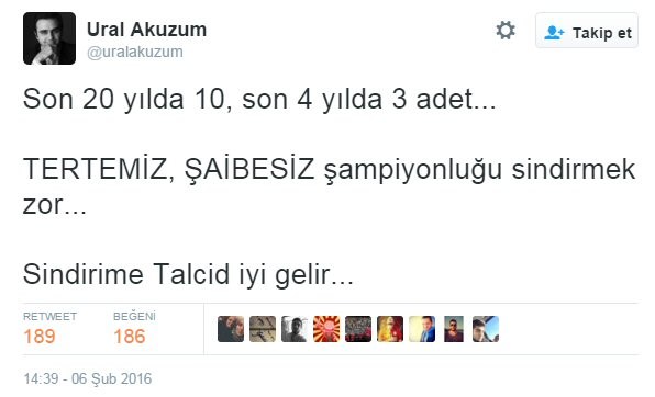 4-2 Antalyaspor'un üstünlüğü ile sona eren maçın ardından "Şikenin kralınıGalatasaray yapmıştır. Galatasaray tarihine baksın" çıkışını yapan Fenerbahçe Kulübü Başkanı Aziz Yıldırım'a, Aküzümtwitter hesabından 'TERTEMİZ, ŞAİBESİZ şampiyonluğu sindirmek zor... Sindirime Talcid iyi gelir...' cevabını verdi.