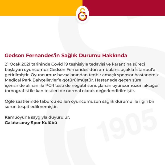 Galatasaray Kulübü, yeni transfer Gedson Fernandes'e yapılan koronavirüs tetkiklerinde bulguya rastlanmadığını açıkladı.