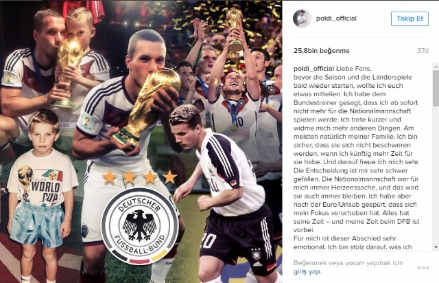 Lukas Podolski, Instagram hesabından yaptığı açıklamada Almanya Milli Takımı'na veda ettiğini belirterek, "Almanya Milli Takımı her zaman kalbimde olacak. Bu takımda yaşadığım her şeyden gurur duyuyorum. Almanya Milli Takımı ile çok büyük başarılar elde ettim. Tüm takım arkadaşlarıma, antrenörlerime, Rudi Voller'e, Jürgen Klinsmann'a ve özellikle de Joachim Löw'e teşekkür ediyorum. En büyük teşekkür ise beni en kötü zamanımda bile destekleyen taraftarlara. Artık bu takımın büyük bir taraftarı olacağım. Almanya Milli Takımı'na gelecekte başarılar diliyorum" ifadesini kullandı.