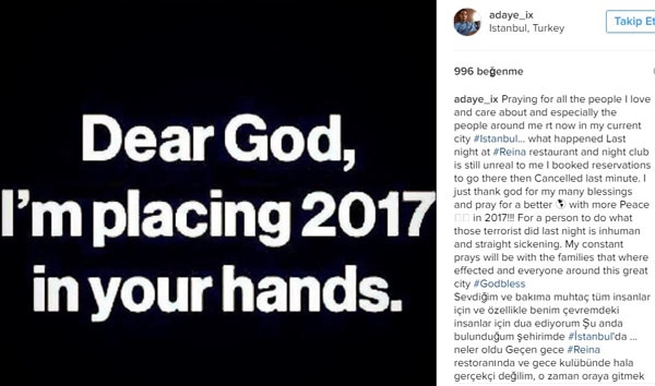 Daye, "Dün gece Reina'da restoranda ve gece kulübünde yaşananlara hala inanamıyorum. Rezervasyonum vardı ve son dakikada iptal etmiştim. Tanrı'ya şükrediyorum ve 2017'de daha iyi, barış içinde bir dünya için dua ediyorum. Bunu yapan teröristler insan değil, cani. Dualarım bu harika şehirdeki insanlar ve saldırıda zarar gören herkesle birlikte" ifadelerini kullandı.