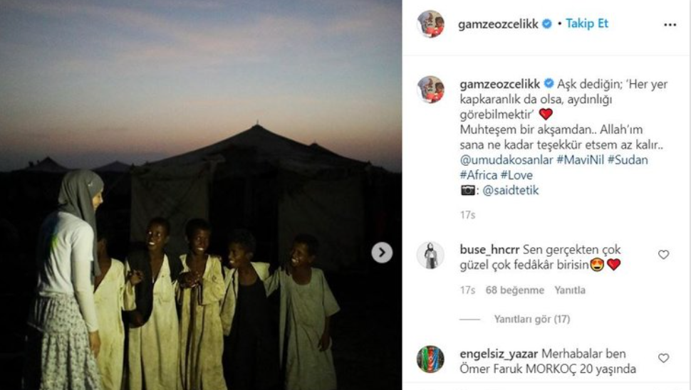 Oyunculuk kariyerinin zirvesindeyken her şeyi bırakıp bambaşka bir hayatı tercih eden Gamze Özçelik sosyal medya paylaşımlarıyla kalpleri ısıtıyor. Yeni hayatı ile takdir toplayan Gamze Özçelik zamanının büyük bir bölümünü Kurduğu dernek aracılığı ile yardıma muhtaç insanlarla geçiriyor. Gamze Özçelik son olarak yaptığı paylaşım ile yine büyük beğeni topladı. İşte Gamze Özçelik'in "Aşk dediğin her yer kapkaranlık da olsa aydınlığı görebilmektir..." notunu düştüğü paylaşımı...