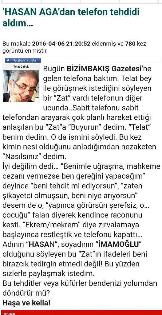 CHP'nin İstanbul Büyükşehir Belediye Başkanı Ekrem İmamoğlu'nun babası Hasan İmamoğlu'nun, 2016 yılında gazeteci Talat Çabuk'a telefonla tehditler savurduğu ortaya çıktı. Ekrem İmamoğlu'nun babasının, oğlunun diplomasındaki usulsüzlükleri yazan gazeteciye yaptığı tehditler, Talat Çabuk'un son yazısına yansıdı.