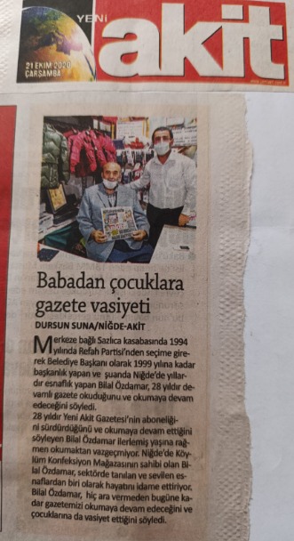 Akit Gazetesi'nin sevdalısı olan ve çocuklarına ölmeden önce Akit Gazetesini okumayı vasiyet eden Niğde'nin esnaflarından Bilal Özdamar amca 81 yaşında rahmetli oldu.