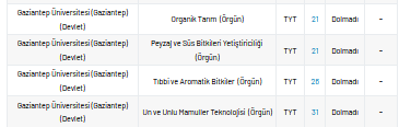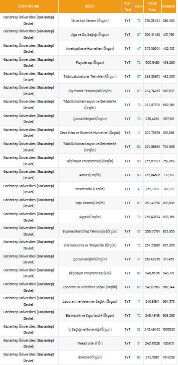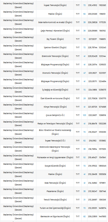 Gaziantep Üniversitesi 2 yıllık taban puanları 2021, yüzdelik dilimleri ve kontenjan sayıları kaçtır?