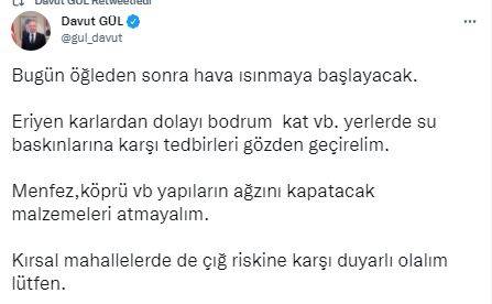 Gaziantep Valisi Davut Gül resmi sosyal medya hesabından öğleden sonra havalarda ısınma yaşanacağına dikkat çekerek, “Eriyen karlardan dolayı bodrum kat vb. yerlerde su baskınlarına karşı tedbirleri gözden geçirelim” dedi.
