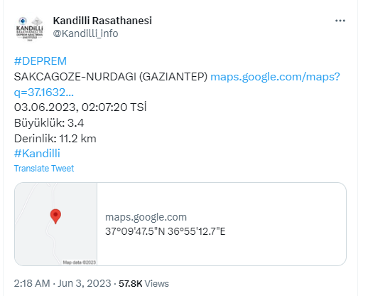 Merkez üssü Gaziantep'in Nurdağı ilçesi olan art arda iki deprem meydana geldi.