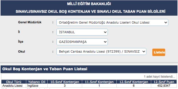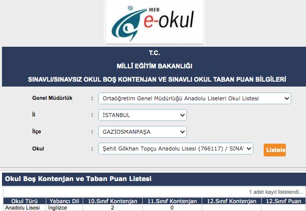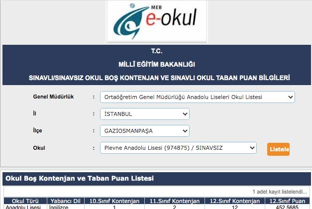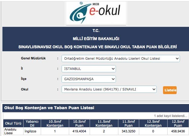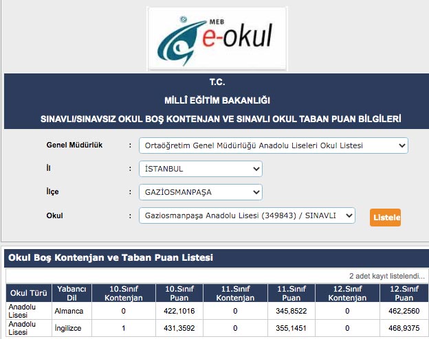 Gaziosmanpaşa lise taban puanları 2020 yüzdelik dilim boş kontenjan
