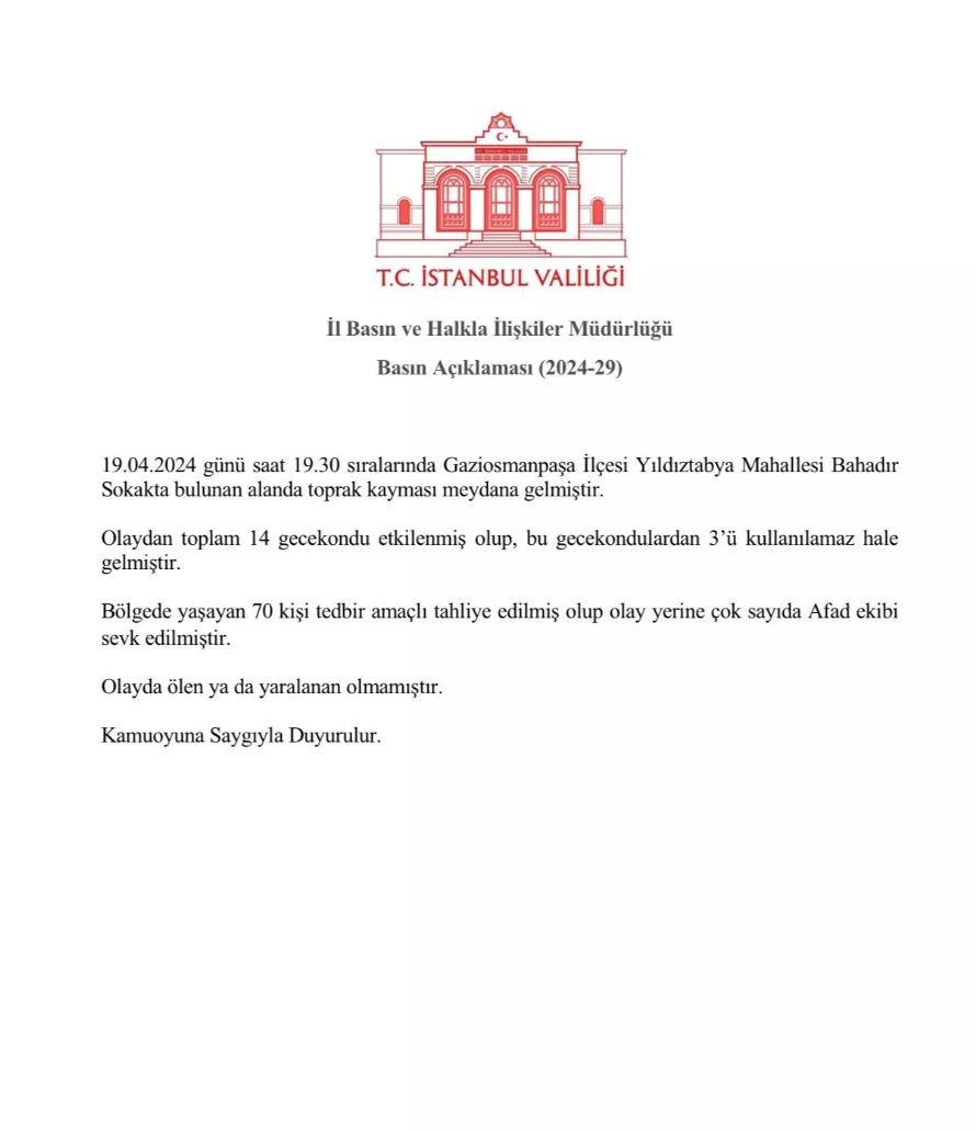 Valilikten yapılan açıklamada, "19.04.2024 günü saat 19.30 sıralarında Gaziosmanpaşa İlçesi Yıldıztabya Mahallesi Bahadır Sokakta bulunan alanda toprak kayması meydana gelmiştir. Olaydan toplam 14 gecekondu etkilenmiş olup, bu gecekondulardan 3'ü kullanılamaz hale gelmiştir. Bölgede yaşayan 70 kişi tedbir amaçlı tahliye edilmiş olup olay yerine çok sayıda AFAD ekibi sevk edilmiştir. Olayda ölen ya da yaralanan olmamıştır." denildi.