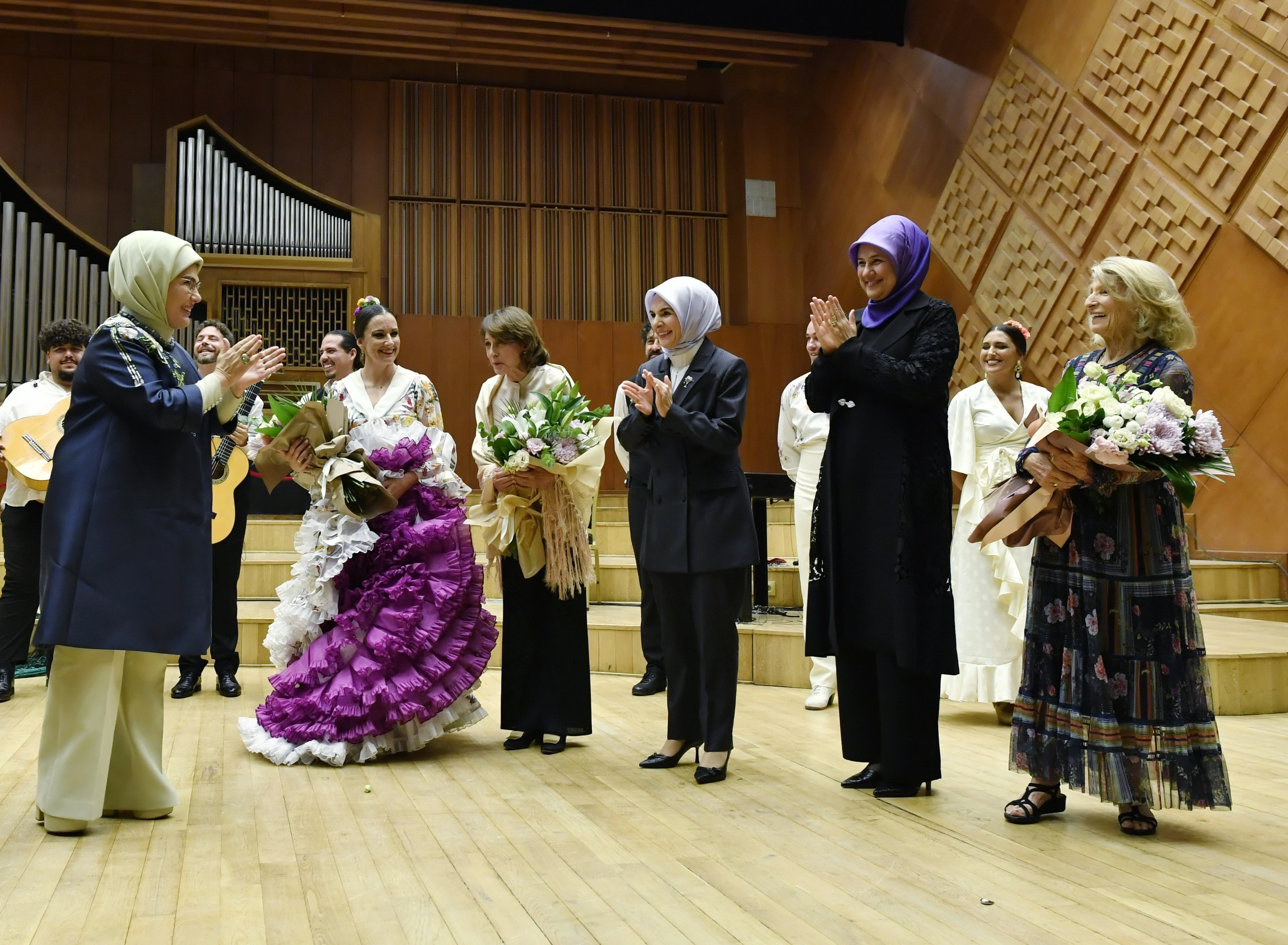 Emine Erdoğan, gösterinin ardından Sevilla Cristina Heeren Flamenko Sanatı Vakfı Başkanı Cristina Heeren'e ve dansçılara çiçek takdim etti.