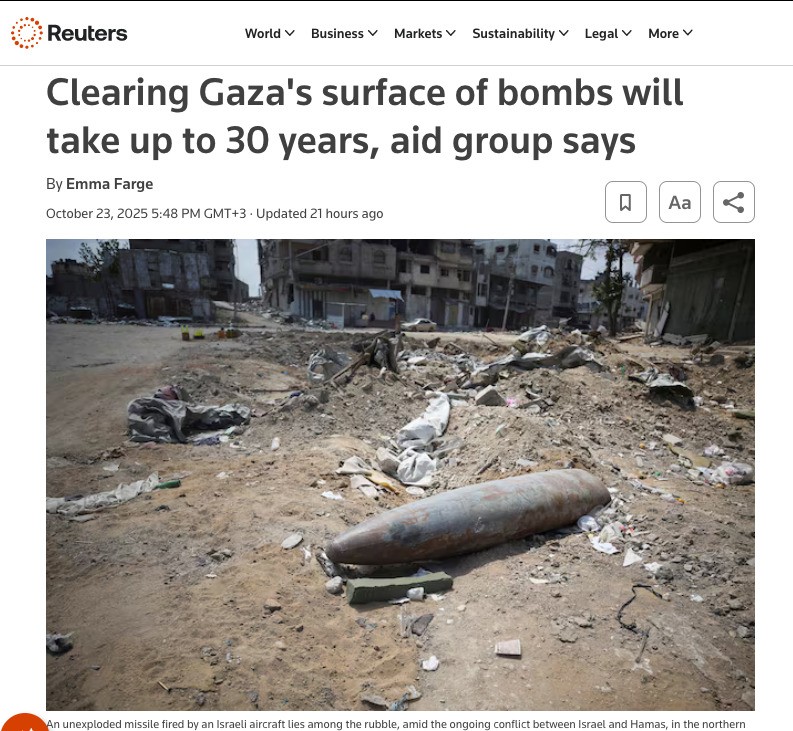 Yardım kuruluşu Humanity & Inclusion’dan bir yetkili, Gazze’nin sokaklarını patlamamış mühimmattan temizlemenin, muhtemelen 20 ila 30 yıl süreceğini söyledi. Yetkili, Perşembe günü savaştan harap olmuş bölgeyi “korkunç, haritası çıkarılmamış bir mayın tarlası” olarak nitelendirdi.