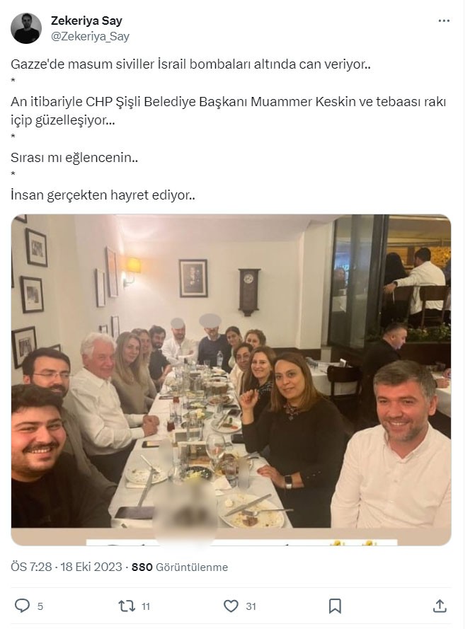 Akit yazarı Zekeriya Say, sosyal medya hesabından yaptığı açıklamada, "Gazze'de masum siviller İsrail bombaları altında can veriyor. An itibariyle CHP Şişli Belediye Başkanı Muammer Keskin ve tebaası rakı içip güzelleşiyor. Sırası mı eğlencenin. İnsan gerçekten hayret ediyor." dedi.