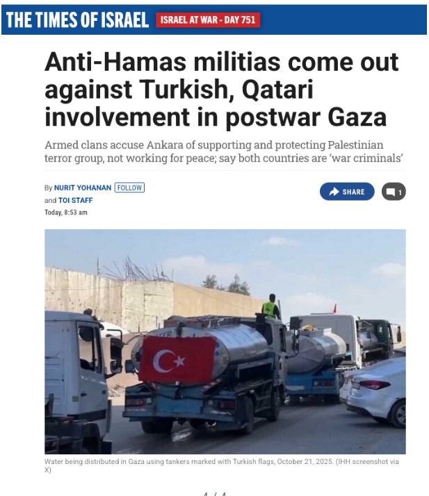 Soykırımcı İsrail’in Türkiye’nin Gazze’de olmasına karşı çıkmasından sonra Yahudi medyası da bunu destekleyecek haberler yapmaya devam ediyor. Gazze’de İsrail adına çalışan ve Hamas’la çatışan hainlerin kurduğu çeteler, Türk askerine karşıymış. İsrail kanalına konuşan çete liderleri, Türkiye’yi ‘Hamas destekçisi savaş suçlusu’ olarak lanse edip Gazze’ye girmelerine karşı olduklarını belirtti.