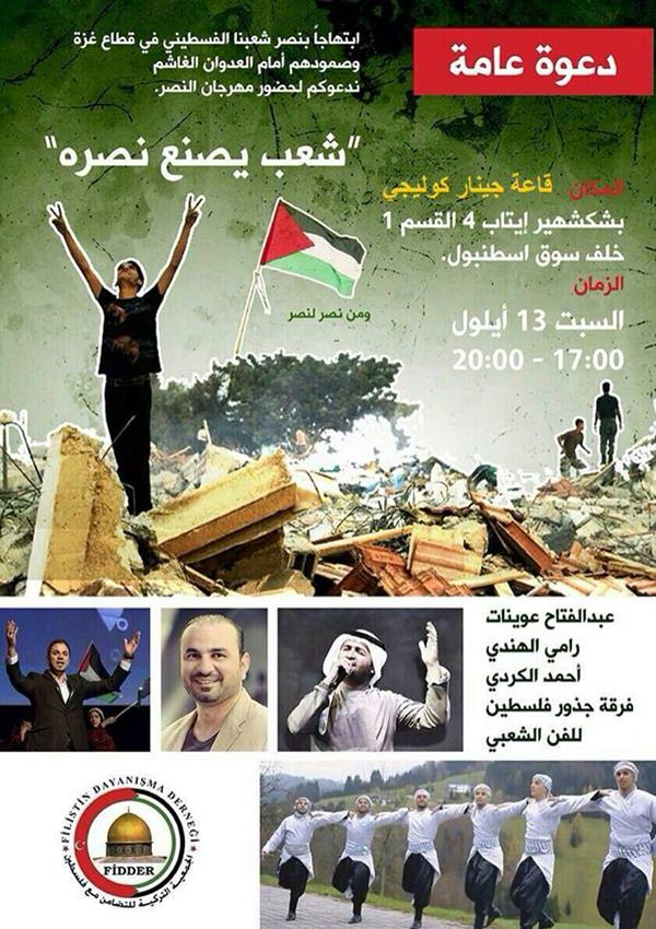 HABER MERKEZİ - 51 gün boyunca Siyonist İsrail’in havadan, karadan ve denizden kendisine yönelen operasyonlarını savaşarak püskürten ve geride 2 bin 155 şehit bırakan Gazze halkı, zaferini İstanbul’da kutluyor. “Halk, kendi zaferini kendisi yazıyor… Zaferden zafere” başlığıyla gerçekleştirilecek Zafer Festivali bugün saat 17.00-20.00 arasında Başakşehir’deki Çınar Koleji’nde gerçekleştirilecek. Etkinliği düzenleyen Filistin Dayanışma Derneği’nden yapılan açıklamada tüm Türkiye halkı etkinliğe davet edildi. Abdülfettah Uveynat, Rami El-Hindî, Ahmed El-Kürdî gibi tanınmış Filistinli sanatçıların katılacağı festivalde ayrıca Filistin’in folklorik gösterileri sahnelenecek.