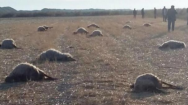 Konya'da meralık alanda otlayan yaklaşık 41 damızlık koyun kimliği belirlenemeyen kişiler tarafından zehirli besi yemi verilerek telef edildi. Can çekişen çoğu koyun ise acı çekmemeleri için sahipleri tarafından boğazları kesildi. 1 yıl öncede aynı yöntemle ve aynı bölgede 58 koyun telef edilmişti.