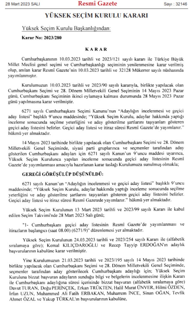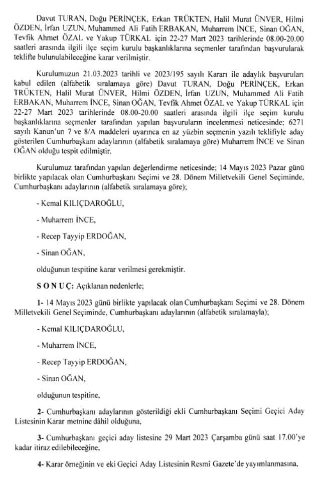 Cumhurbaşkanlığı seçimleri için "Geçici Aday Listesi" Resmi Gazete'de yayımlandı. Buna göre 14 Mayıs'ta gerçekleşecek seçimlerde Cumhurbaşkanı ve AK Parti Genel Başkanı Recep Tayyip Erdoğan, CHP Genel Başkanı Kemal Kılıçdaroğlu, Memleket Partisi Genel Başkanı Muharrem İnce ve ATA İttifakı adayı Sinan Oğan yarışacak.