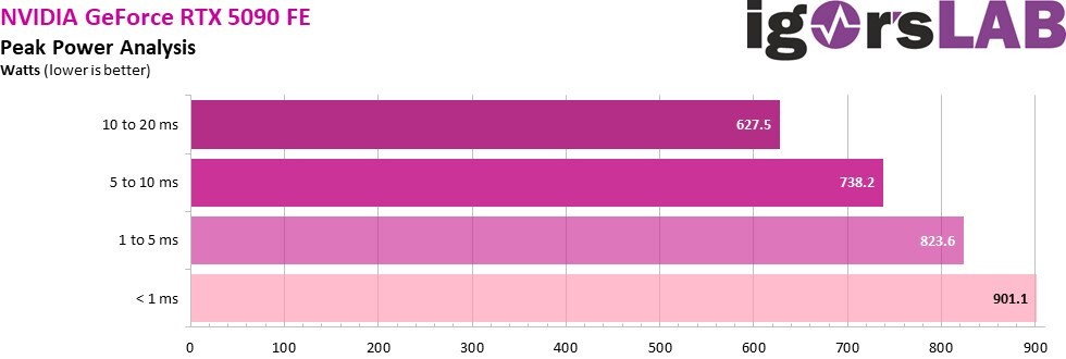 Test sonuçlarına baktığımızda ise, RTX 5090'ın 10 ms ila 20 ms sürelerde 627,5 W'a kadar; 5 ms ila 10 ms sürelerde 738,2 W'a kadar, 1 ms ila 5 ms kategorisinde 823,6W'a kadar, 1 ms'nin altındaki sürelerde ise 901,1 W'a kadar yüksek dalgalanmalara ulaşabildiğini görüyoruz. Ancak bu değerlerin güç limitini (600 W) aşan kısa süreli güç artışlarını temsil ettiğini söyleyelim.