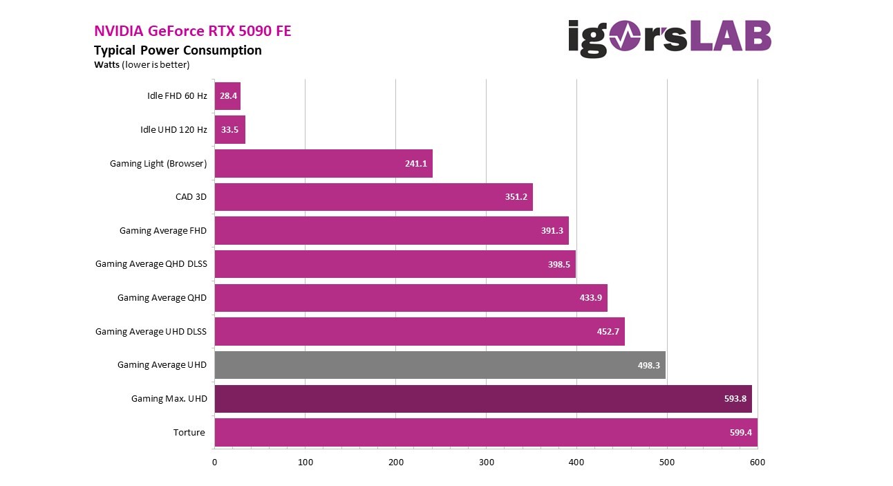 Zirve değerlere ek olarak, RTX 5090 boşta 28,4W ila 35.5W arasında güç tüketimine sahip. Bu değer, aynı zmanda monitörün kullandığı çözünürlük ve yenileme hızıyla da ilgili. Son olarak ekran kartı standart kullanımda 241W, 4K oyun deneyiminde ise 591W tüketime sahip.