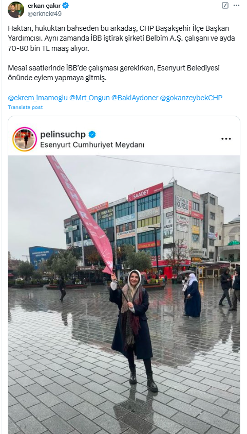 Terör örgütü PKK'lı çıkan CHP'li Ahmet Özer'e destek için Esenyurt Belediyesi'nin önüne giden ve orada CHP bayrağı sallayarak şov yapan CHP Başakşehir İlçe Başkan Yardımcısı Pelinsu Sancaklı'nın İBB'den 80 bin TL maaş aldığı ifade eden Çakır'ın paylaşımı şöyle: