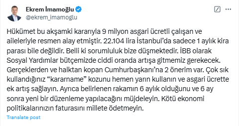 Hükümet bu akşamki kararıyla 9 milyon asgari ücretli çalışan ve aileleriyle resmen alay etmiştir. 22.104 lira İstanbul’da sadece 1 aylık kira parası bile değildir. Belli ki sorumluluk bize düşmektedir. İBB olarak Sosyal Yardımlar bütçemizde ciddi oranda artışa gitmemiz gerekecek. Gerçeklerden ve halktan kopan Cumhurbaşkanı’na 2 önerim var. Çok sık kullandığınız “kararname” kozunu hemen yarın kullanın ve asgari ücrette ek artış sağlayın. Ayrıca belirlenen rakamın 6 aylık olduğunu ve 6 ay sonra yeni bir düzenleme yapılacağını müjdeleyin. Kötü ekonomi politikalarınızın faturasını millete ödetmeyin.