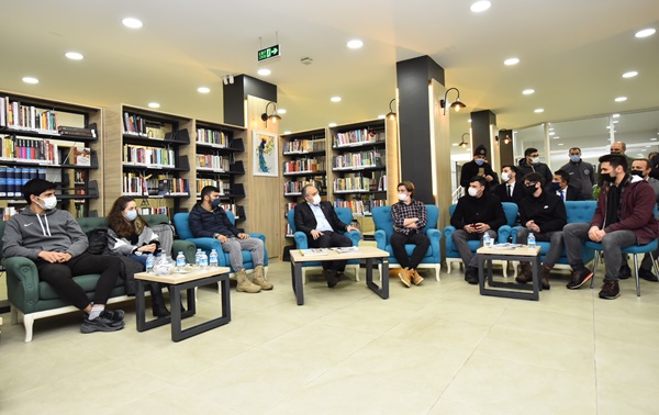 Anaokulundan ortaokula, liseden üniversiteye kadar eğitimin tüm kademelerinde öğrencilere destek olacak yatırımları hız kesmeden sürdüren Bursa Büyükşehir Belediyesi’nin geçtiğimiz yıl Yıldırım İlçesi’ne kazandırdığı Millet Kıraathanesi, özellikle sınavlara hazırlanan gençlerin gözde mekanı oldu. Pandemi tedbirleri nedeniyle seyreltilmiş düzende yarı kapasite ile hizmet veren Yıldırım Millet Kıraathanesi, özellikle KPSS ve YKS’ye hazırlanan gençlerin eğitim üssü oldu. Fırsat buldukça Millet Kıraathanesini ziyaret edip, sınavlara hazırlanan gençlere moral veren Bursa Büyükşehir Belediye Başkanı Alinur Aktaş, yine gençlerle buluştu. Gençlerin Büyükşehir Belediyesi’nden taleplerini dinleyen Başkan Aktaş, onların şehir ve ülke gündemine dair sorularını yanıtladı. Sohbet havasında geçen buluşmada gençlerle tecrübelerini paylaşan Başkan Aktaş, gençlere bir hedef koymaları ve o hedefe ulaşmak için azimle çalışmaları yönünde tavsiyelerde bulundu.