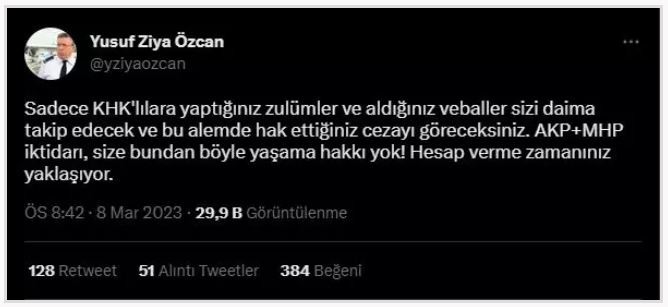 "Bu alemde hak ettiğiniz cezayı göreceksiniz" iddiasında bulunan Özcan, skandal bir üslup kullanarak "AKP+MHP iktidarı, size bundan böyle yaşama hakkı yok!" ifadeleriyle alenen AK Parti ve MHP'yi tehdit etti.