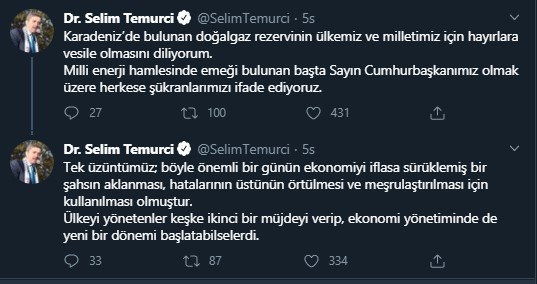 Sosyal medya hesabından Karadeniz'deki doğalgazın Türkiye'ye ve millete hayırlı olması dileklerinde bulunan, Cumhurbaşkanı Recep Tayyip Erdoğan başta olmak üzere emeği geçenlere teşekkür eden Selim Temurci, ilginç bir teşekkür açıklamasında bulundu.