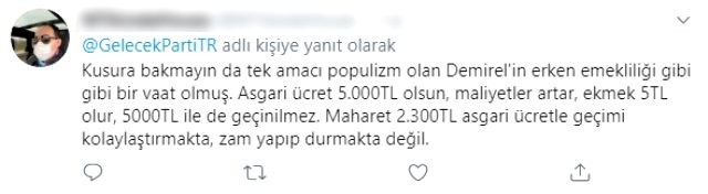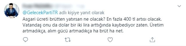 Eski Başbakanlardan Ahmet Davutoğlu'nun kurduğu Gelecek Partisi, sosyal medyadan yaptığı paylaşımla asgari ücretlinin maaşından yapılan kesintiyi eleştirdi. "Asgari ücretlinin cebine brüt maaşının tamamı girecek" ifadelerine yer verilen paylaşım, takipçiler tarafından aleyhte yorum yağmuruna tutuldu.