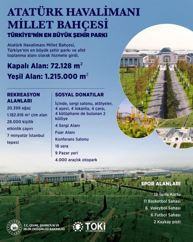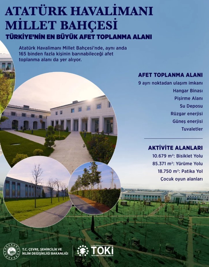 Kurum, paylaşımında, "Türkiye’nin en büyük şehir parkı Atatürk Havalimanı Millet Bahçesi, İstanbul’umuza afette sığınak, her anda nefes olacak." ifadelerini kullandı.