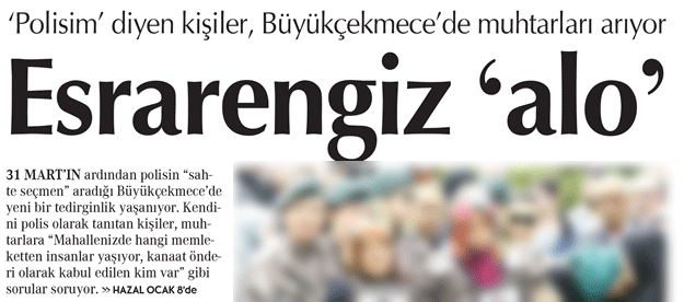Cumhuriyet gazetesi dün yayınladığı haberinde "Büyükçekmece'de polis olduğunu söyleyen kişiler muhtarlara ‘kim nereli’ diye soruyor" iddiasında bulundu. Haberini hiç bir belgeye ve delile dayandıramayan paçavranın yalanı ise kısa sürdü.