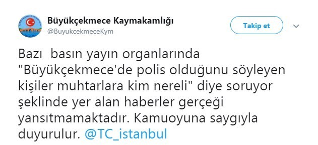 Büyükçekmece Kaymakamlığı sosyal medya hesabından yaptığı "Bazı basın yayın organlarında 'Büyükçekmece'de polis olduğunu söyleyen kişiler muhtarlara kim nereli diye soruyor' şeklinde yer alan haberler gerçeği yansıtmamaktadır. Kamuoyuna saygıyla duyurulur."açıklaması ile gazetenin mesnetsiz iddiasını birinci ağızdan yalanladı.