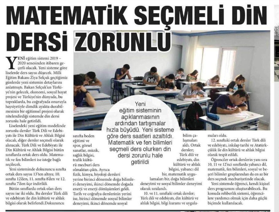 Yalan haberle algı oluşturma görevi verilen Kemalist medyanın diğer bir organı Yurt gazetesi Milli Eğitim Bakanlığı’nın açıkladığı yeni eğitim modelinde Matematik ve Fen dersinin zorunlu olmaktan çıkarıldığı iddiasında bulundu. Mevcut modelde zaten zorunlu olan din dersinin yeni modelde de zorunlu olmasından rahatsız olan gazete, Matematik ve Fen dersleri üzerinden yalan uydurarak kendi okuyucularına algı operasyonu çekti.