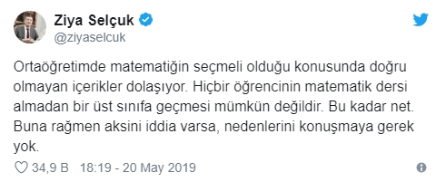 Söz konusu iddialarla ilgili sosyal medya hesabından açıklama yapan Milli Eğitim Bakanı Ziya Selçuk, matematiğin seçmeli olduğu konusunda doğru olmayan içeriklerin dolaştığını belirterek, "Hiçbir öğrencinin matematik dersi almadan bir üst sınıfa geçmesi mümkün değildir. Bu kadar net." CHP taşeronu gazetenin yalanını suratına vurdu.