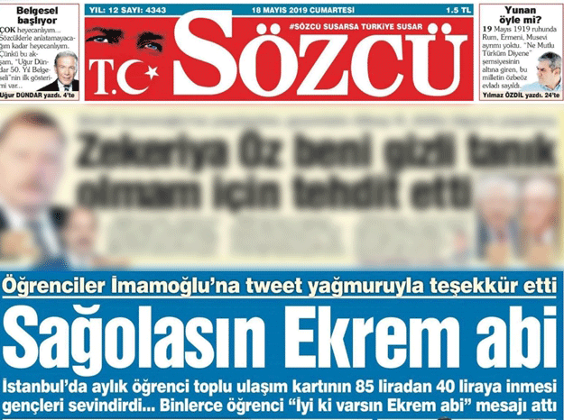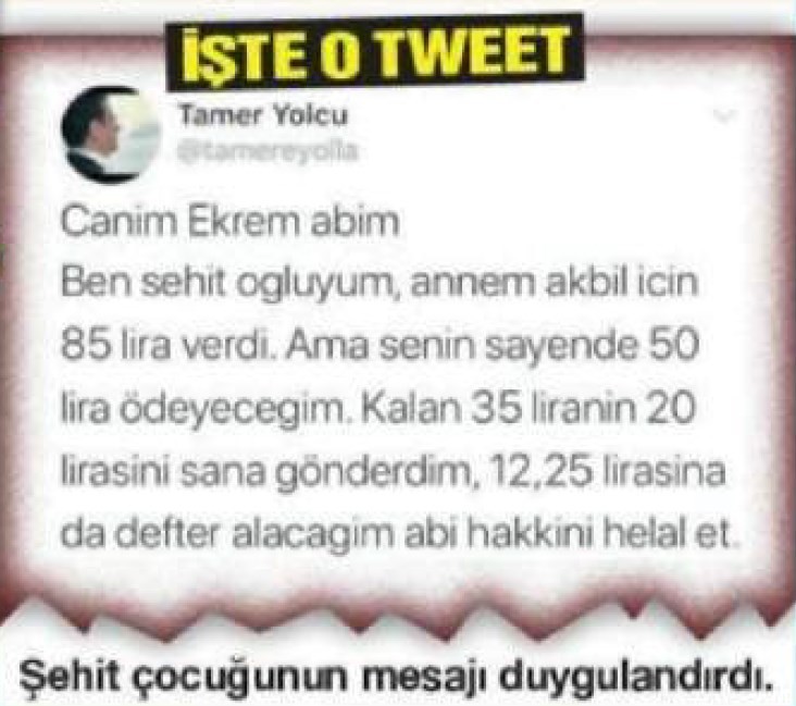 Ulaşım kartlarının şehit yakınlarına 2013 yılından bu yana ücretsiz olmasına rağmen okuyucularını keriz yerine koyan Sözcü, İmamoğlu’nu şişirmek adına şehit çocuğuna aitmiş gibi atılan sahte bir ‘teşekkür’ tweetini birinci sayfasından vererek duygu sömürüsünde bulundu.