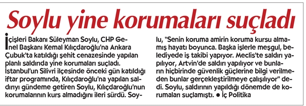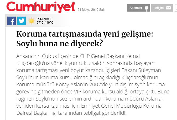 Cumhuriyet gazetesi dünkü haberinde ise Kılıçdaroğlu’nun koruma müdürü Koray Aslan’ın 2002’de yurt dışı misyon koruma görevine gitmeden önce VIP koruma kursu aldığını iddia ederek kendince Bakan Soylu’yu yalan atmakla itham etti.