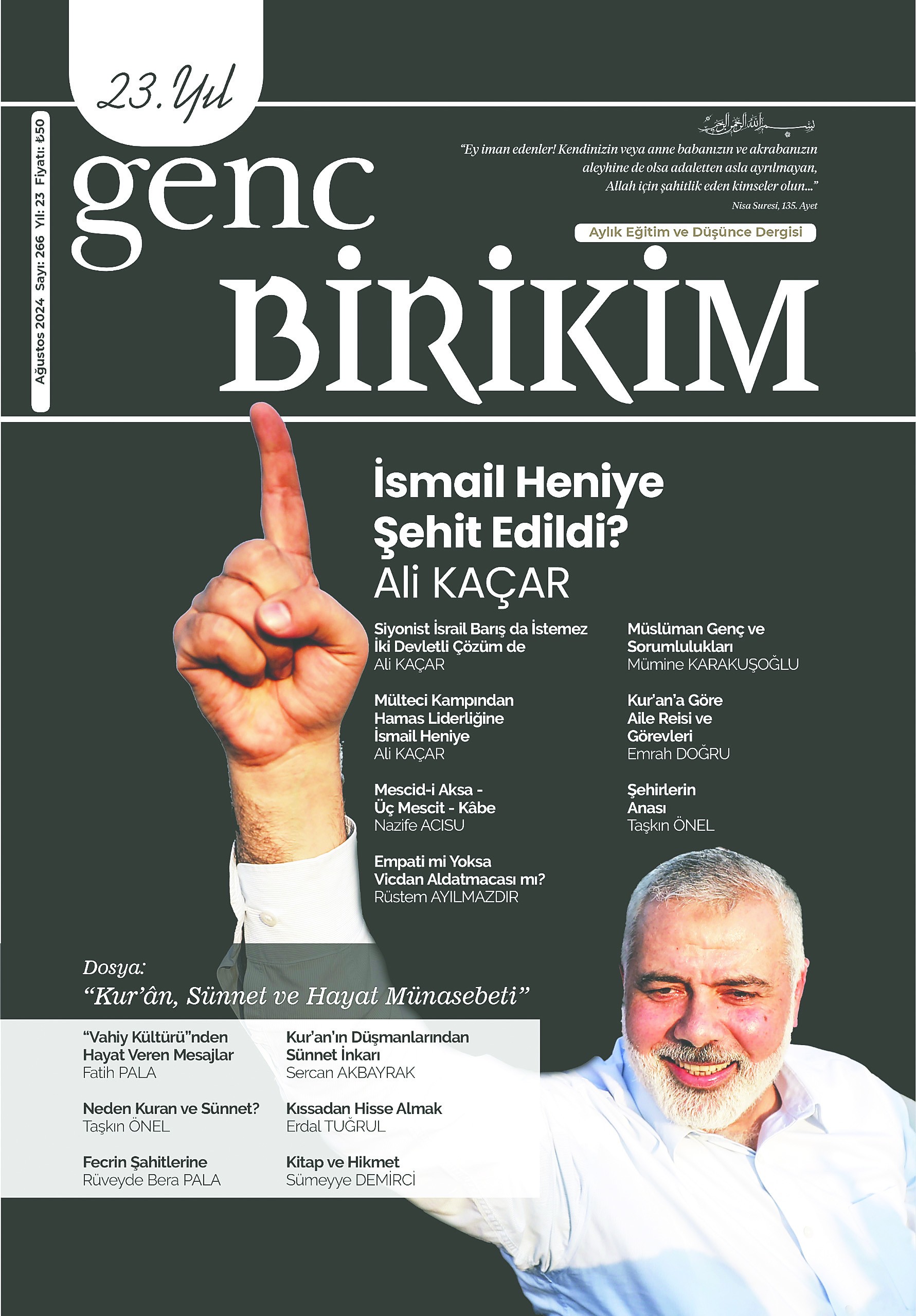 Bu sayıda, araştırmacı yazar Ali Kaçar, “İsmail Heniye Şehid Edildi” başlıklı yazısında; 31 Temmuz gecesi suikast sonucu şehit düşen Filistin’in öncülerinden İsmail Heniye’nin ve diğer şehitlerimizin dökülen kanlarıyla; katiller güruhuna, işbirlikçi hain ülke yöneticilerine gerekli dersin verilmesi gerektiğini dile getirmiş.