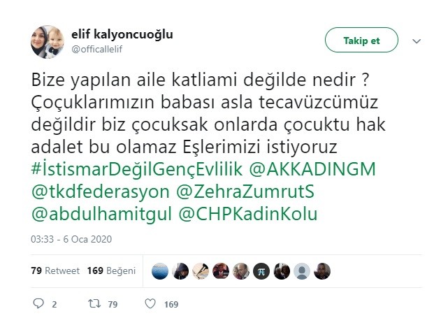 Genç evlilik mağdurlarından Elif Kalyoncu da "Bize yapılan aile katliamı değilde nedir ? Çocuklarımızın babası asla tecavüzcümüz değildir. Biz evlendiğimizde çocuksak onlarda çocuktu. Hak ve adalet bu olamaz Eşlerimizi istiyoruz."