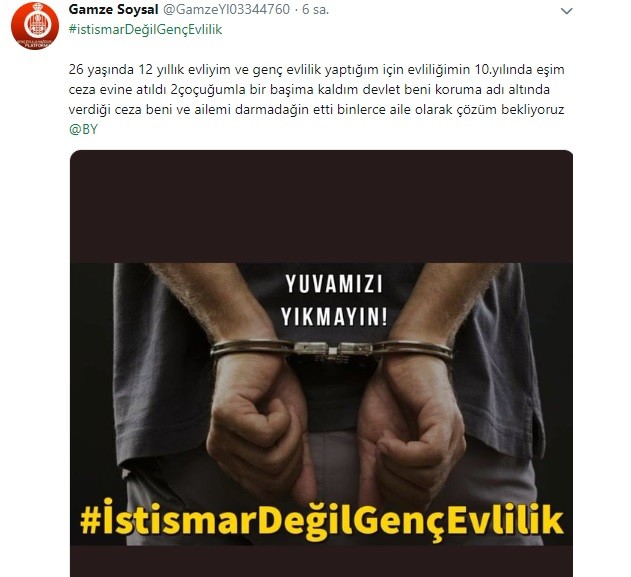 "26 yaşında 12 yıllık evliyim ve genç evlilik yaptığım için evliliğimin 10.yılında eşim ceza evine atıldı 2 çoçuğumla bir başıma kaldım. Devletin beni koruma adı altında verdiği ceza, ailemi darmadağın etti. Binlerce aile olarak çözüm bekliyoruz."