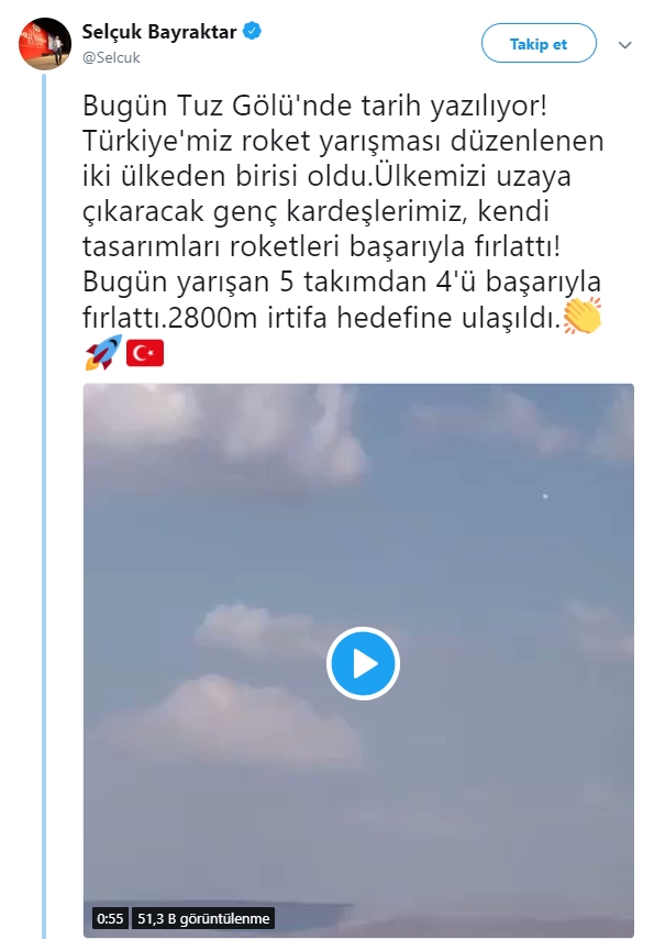"Bugün Tuz Gölü'nde tarih yazılıyor! Türkiye'miz roket yarışması düzenlenen iki ülkeden birisi oldu.Ülkemizi uzaya çıkaracak genç kardeşlerimiz, kendi tasarımları roketleri başarıyla fırlattı! Bugün yarışan 5 takımdan 4'ü başarıyla fırlattı. 2800m irtifa hedefine ulaşıldı.