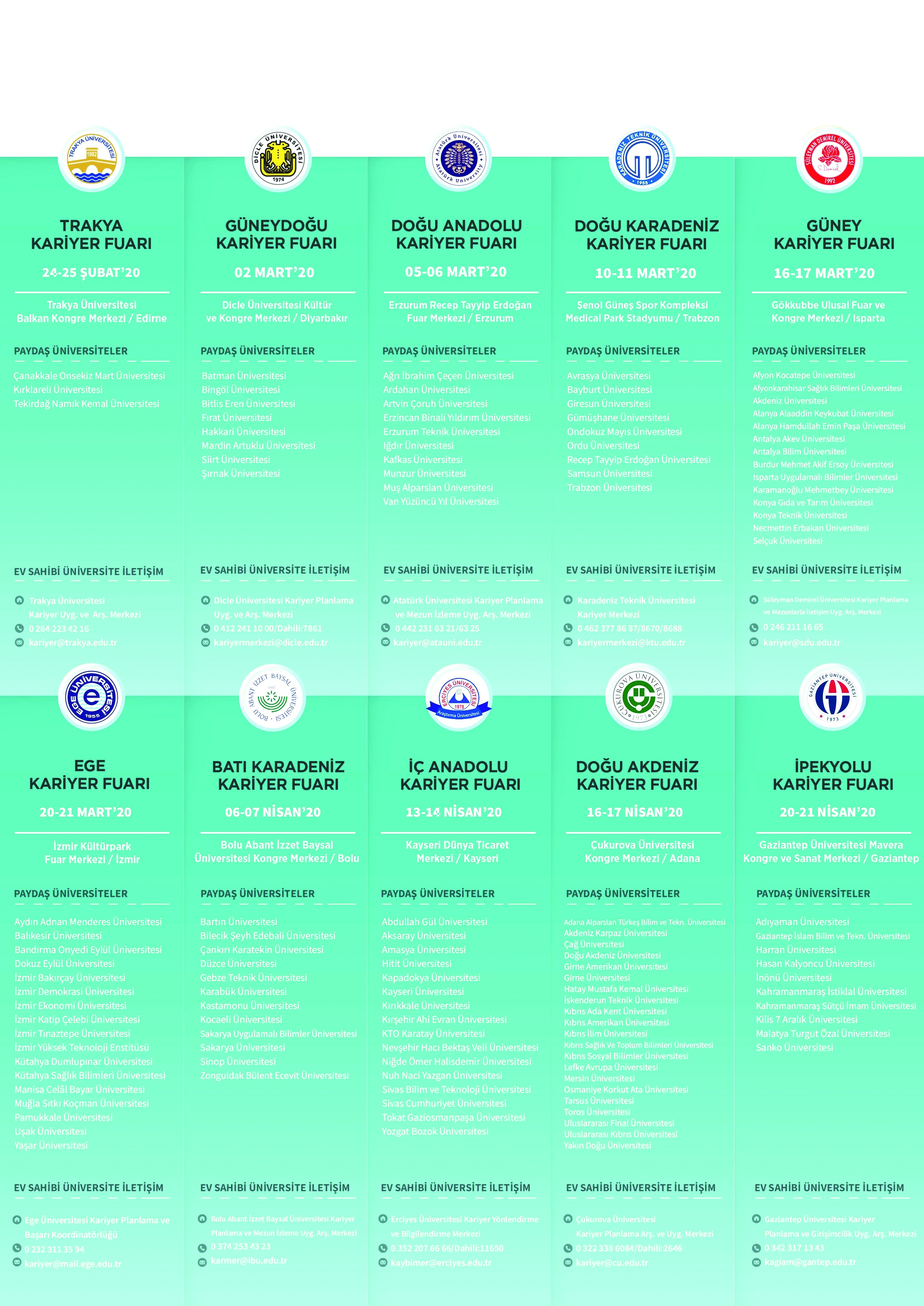 2020 yılında ‘Yetenek Her Yerde’ temasıyla ikincisi düzenlenecek kariyer etkinliklerinin fuar takvimi açıklandı. Program kapsamında, 130 üniversitenin işbirliği ile 10 ilde fuar düzenlenecek. Cumhurbaşkanlığı himayelerinde, İnsan Kaynakları Ofisi Başkanlığı tarafından gerçekleştirilen kariyer etkinlikleri; üniversiteler, kamu ve özel sektör kurumları ve meslek odalarının işbirliği ile gerçekleştiriliyor.