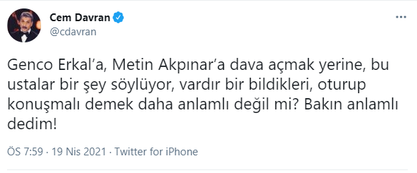 Genco Erkal'ın yaptığını masumlaştırma ve normalleştirme çabasına girişen Cem Davran, "Genco Erkal’a, Metin Akpınar’a dava açmak yerine, bu ustalar bir şey söylüyor, vardır bir bildikleri, oturup konuşmalı demek daha anlamlı değil mi? Bakın anlamlı dedim" ifadelerini kullandı.