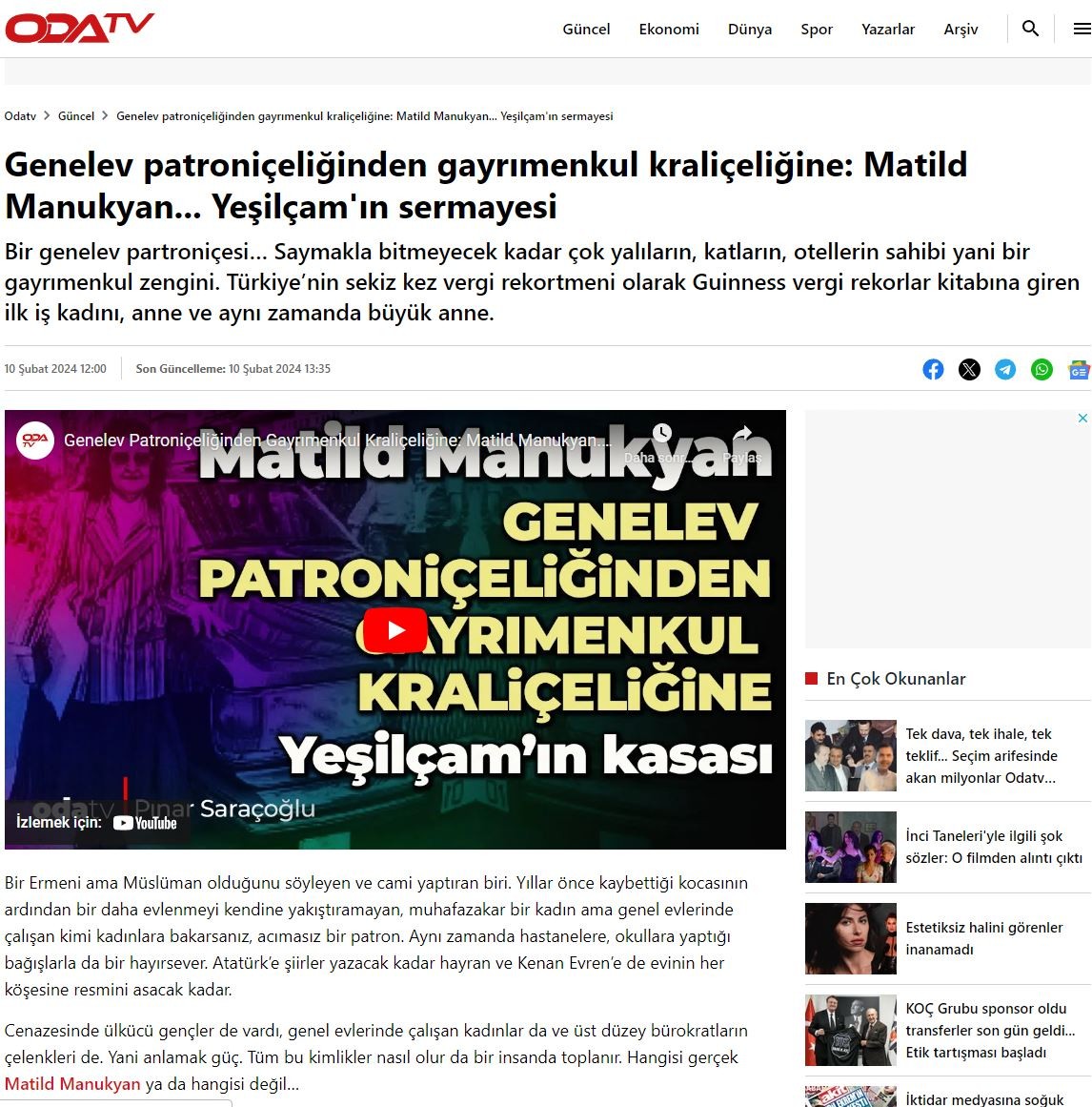 Oda TV genelev patroniçesi Matild Manukyan'ın hayatını anlatan bir video yayımladı. Videoda Manukyan adeta örnek bir vatandaş ve girişimci olarak tanımlandı.
