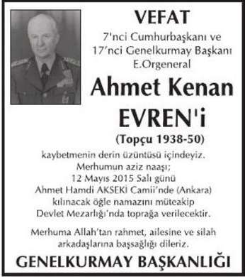 "7'nci Cumhurbaşkanı ve 17'nci Genelkurmay Başkanı E. Orgeneral Ahmet Kenan Evren'i kaybetmenin derin üzüntüsü içindeyiz. Merhumun aziz naaşı; 12 Mayıs 2015 Salı günü Ahmet Haseki Camii'nde (Ankara) kılınacak öğle namazını müteakip Devlet Mezarlığı'nda toprağa verilecektir. Merhuma Allah'tan rahmet, ailesine ve silah arkadaşlarına başsağlığı dileriz."