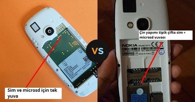 Sahte olan 3310 ise yeşil bir elektronik devreye sahip değil. Bir tür plastik katmanla kaplı. Çift sim yuvası var. Girişler açık ve görünür, gömülü değil. Hafıza kartı yuvası ise Sim yuvasının biraz üzerinde yükseltilmiş şekilde.