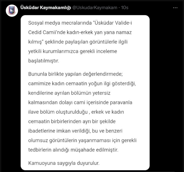 Üsküdar Valide-i Cedid Camisinde kadın ve erkeklerin yan yana namaz kıldıkları yönündeki haberlerin aydından İlçe Kaymakamlığı'ndan kamuoyu bilgilendirmesi geldi.